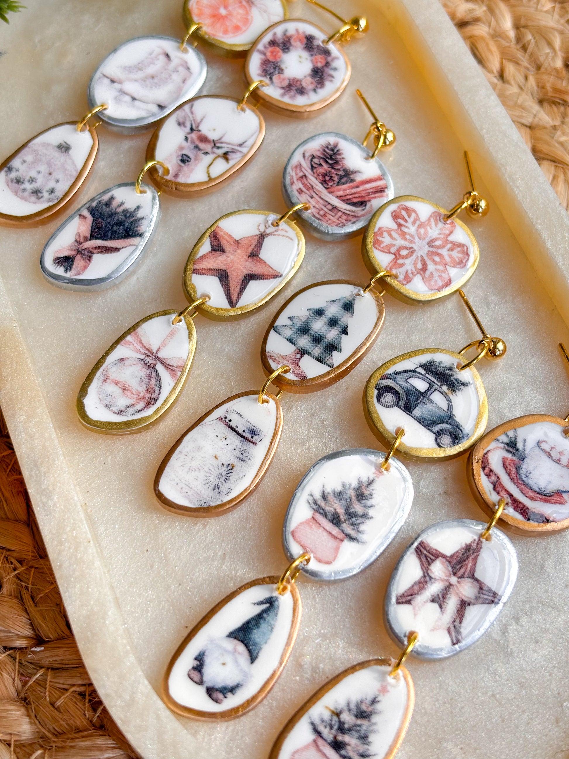 Each pair of earrings is completely different with a selection of cute festive designs and a mix of silver, gold and bronze edges.