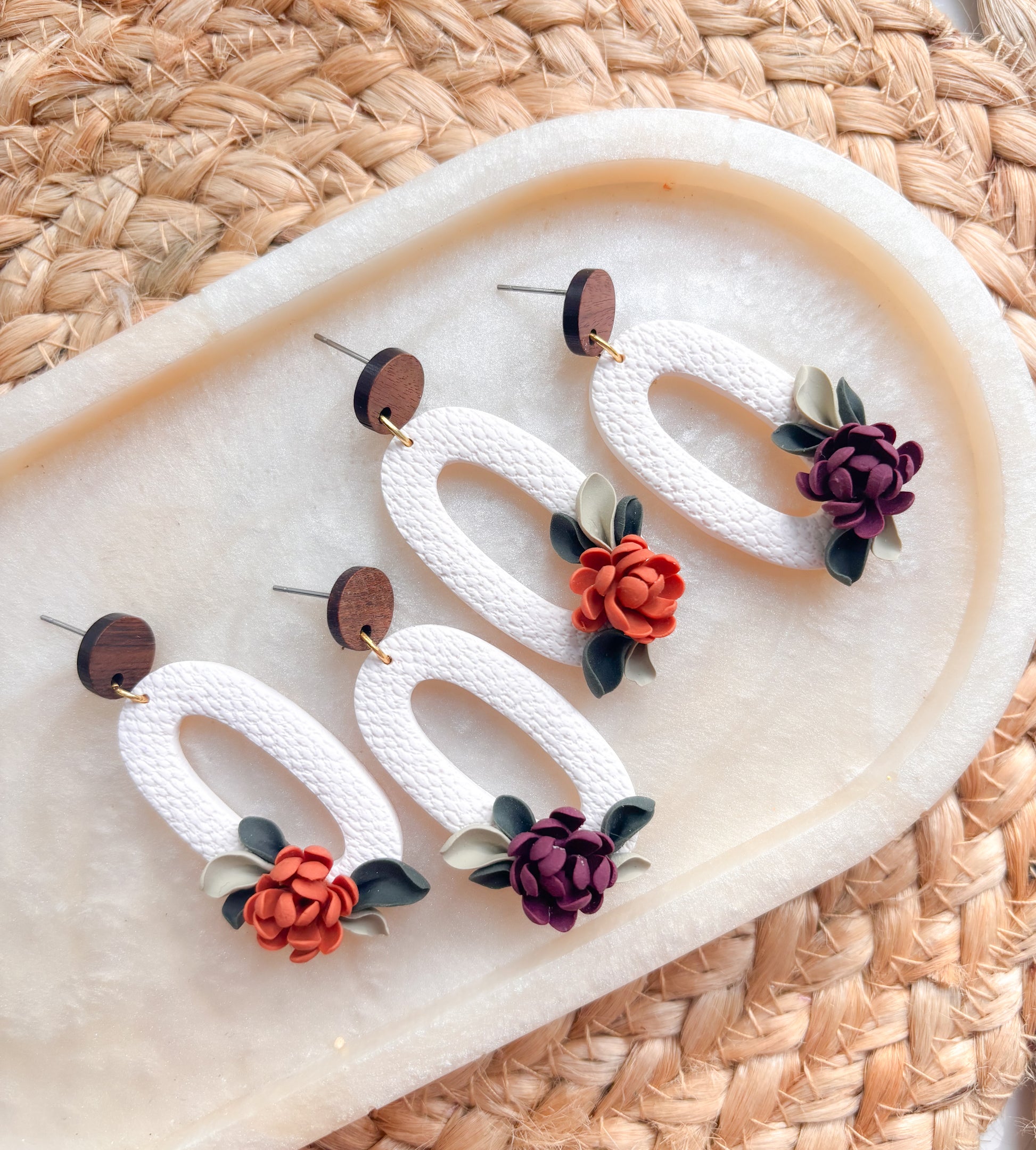 Do not spray with perfume or hair spray as this will discolour the clay and findings.