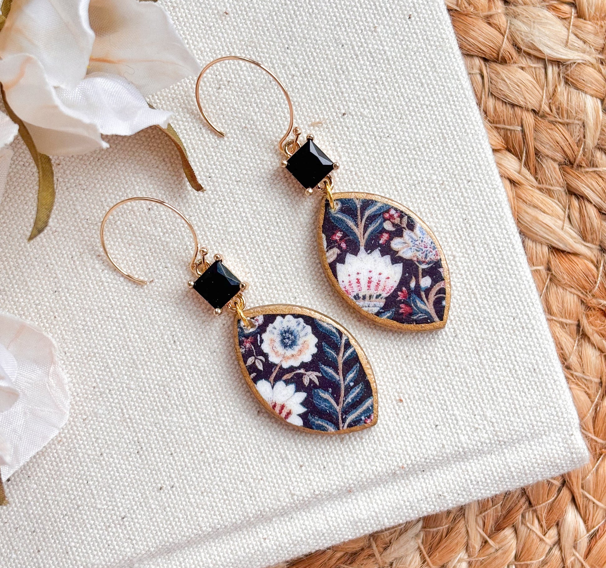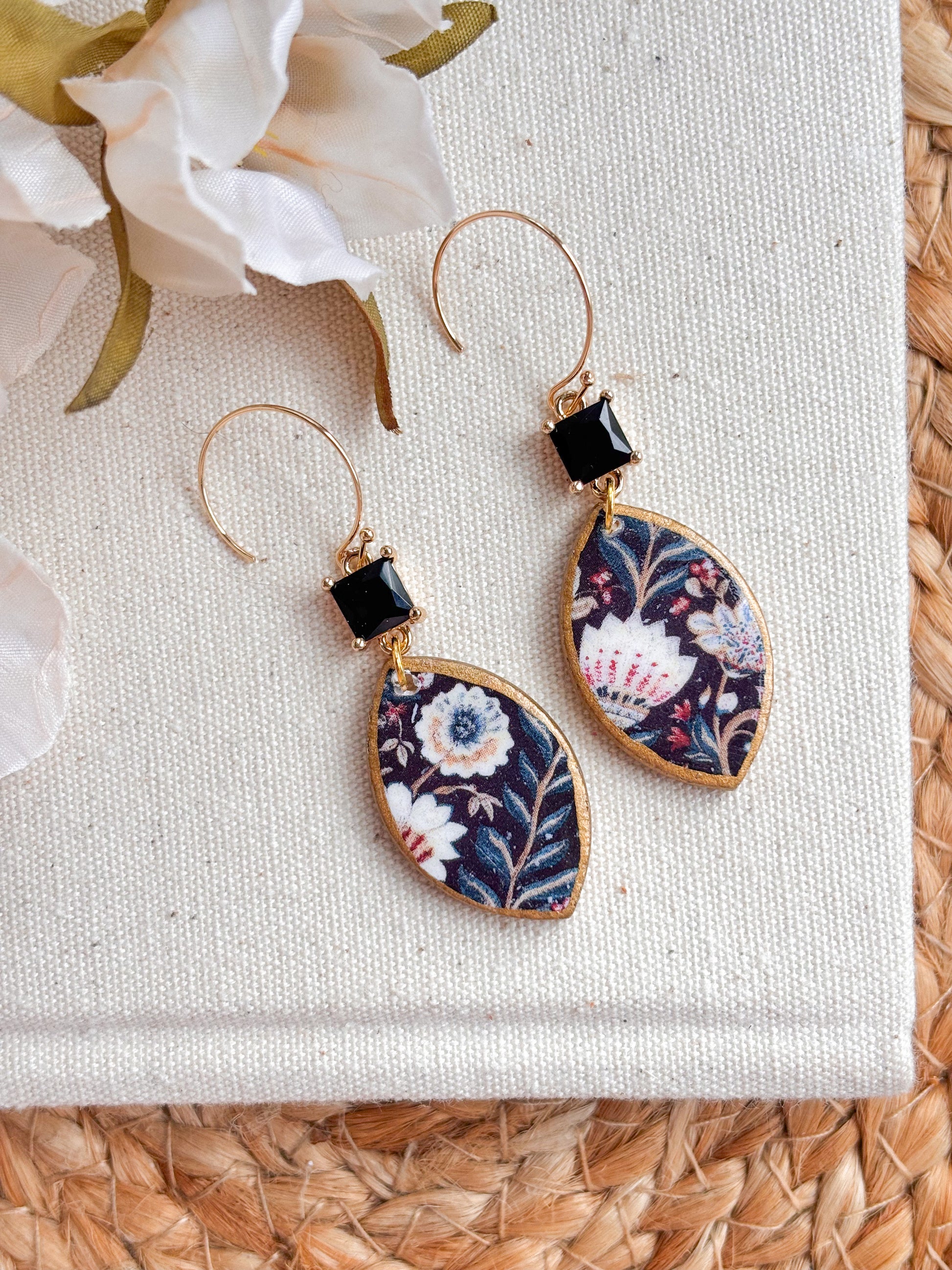 Eye catching dark florals with on a pointed oval handcrafted charms with small black glass charms on small circular hooks.