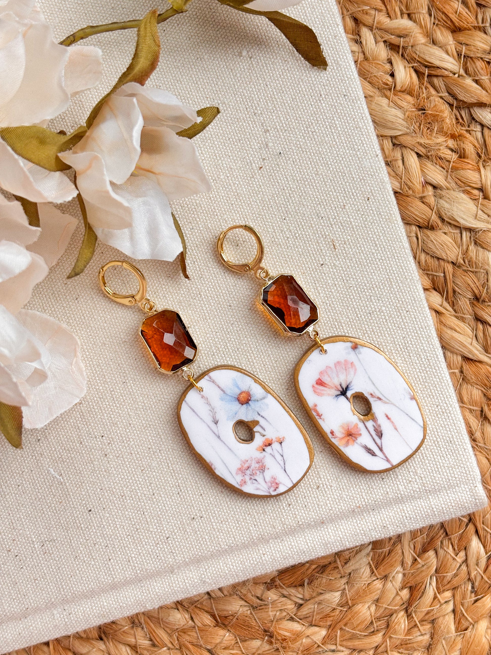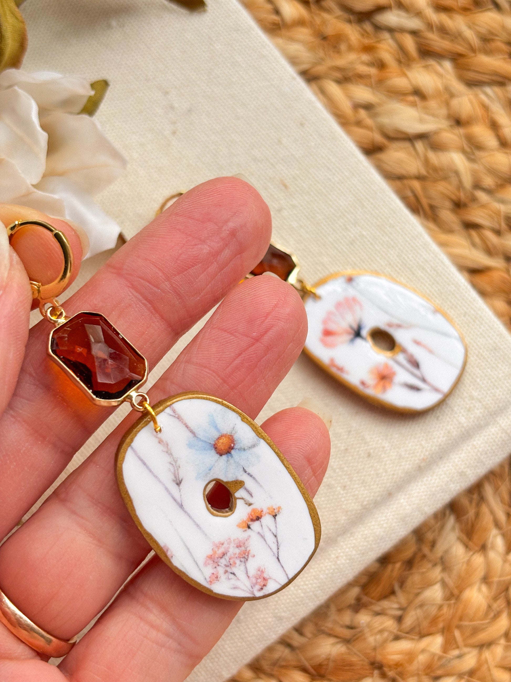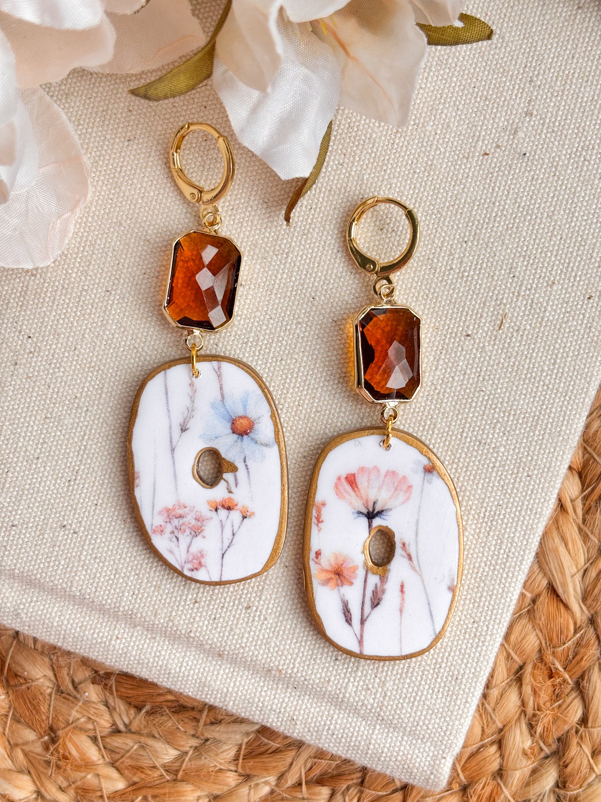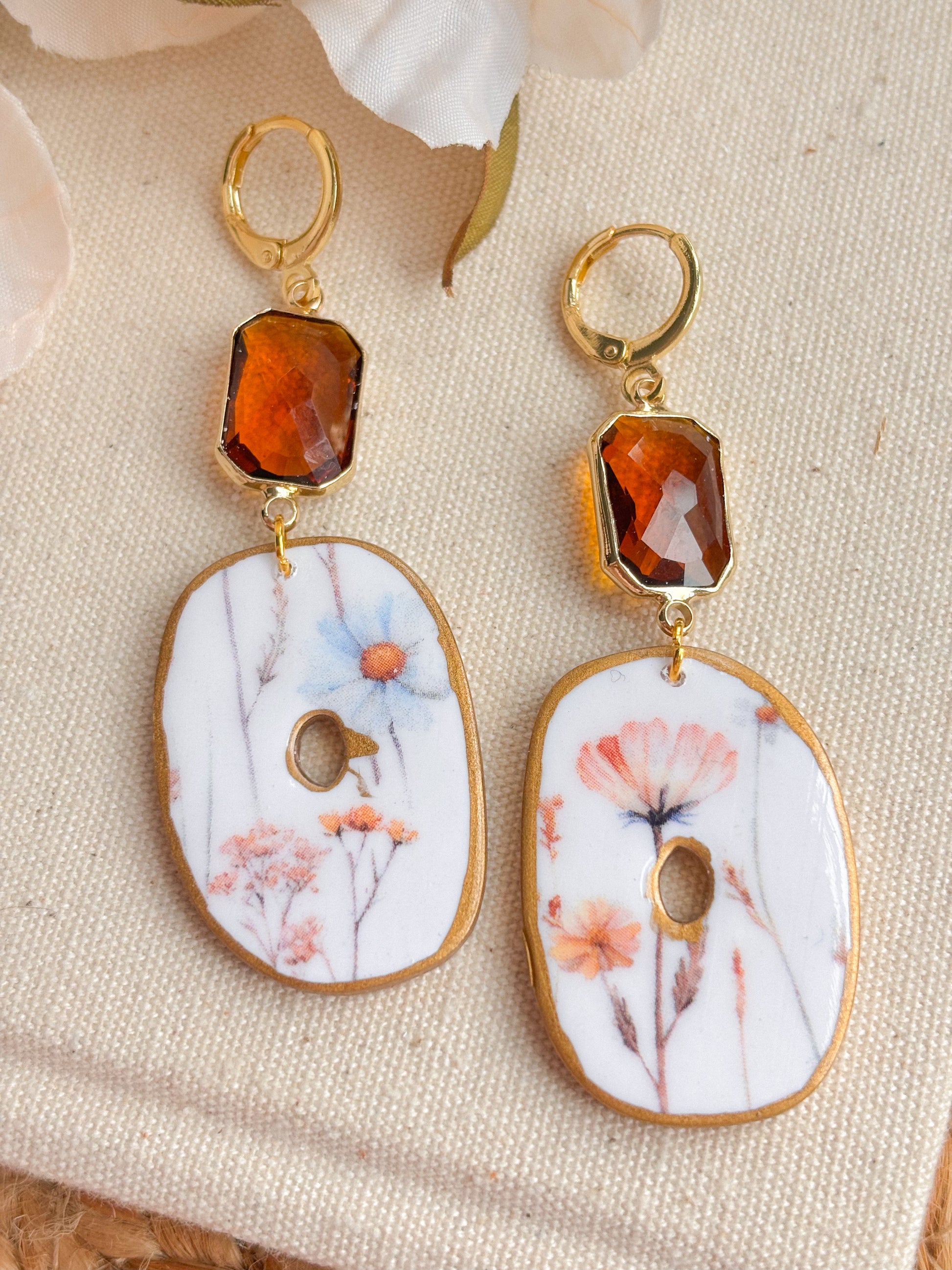 Sweet organic oval handcrafted charms with daisy print with amber glass charms and gold plated hypoallergenic huggies.