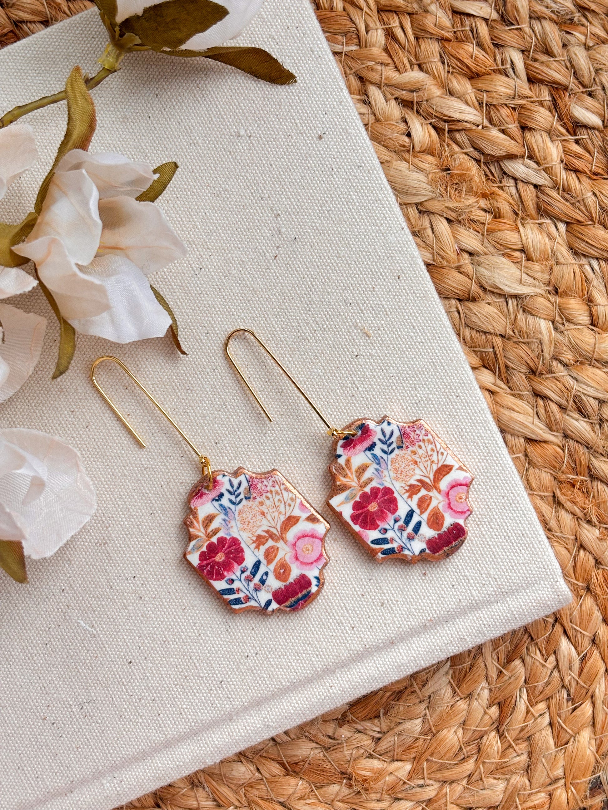 Sweet coral and pink floral design charms on gold plated long hooks.