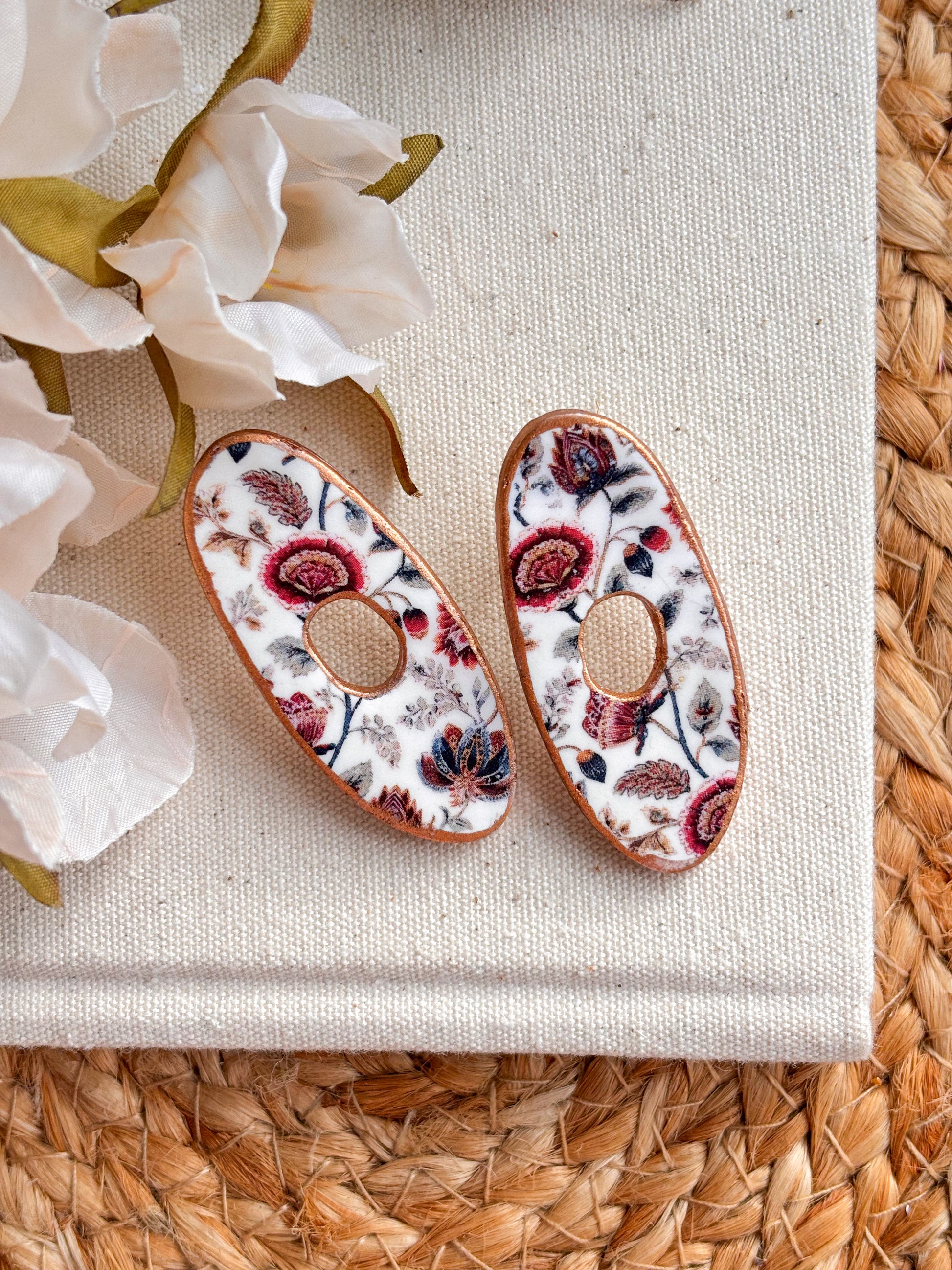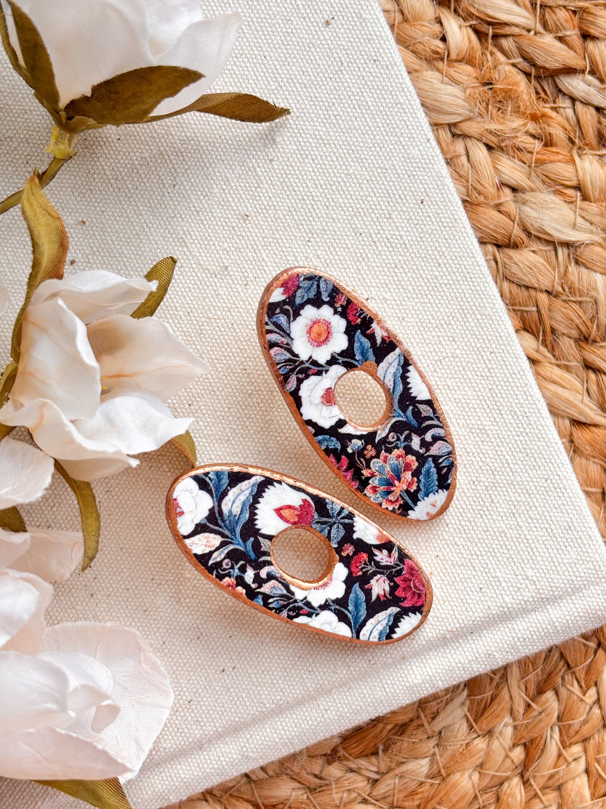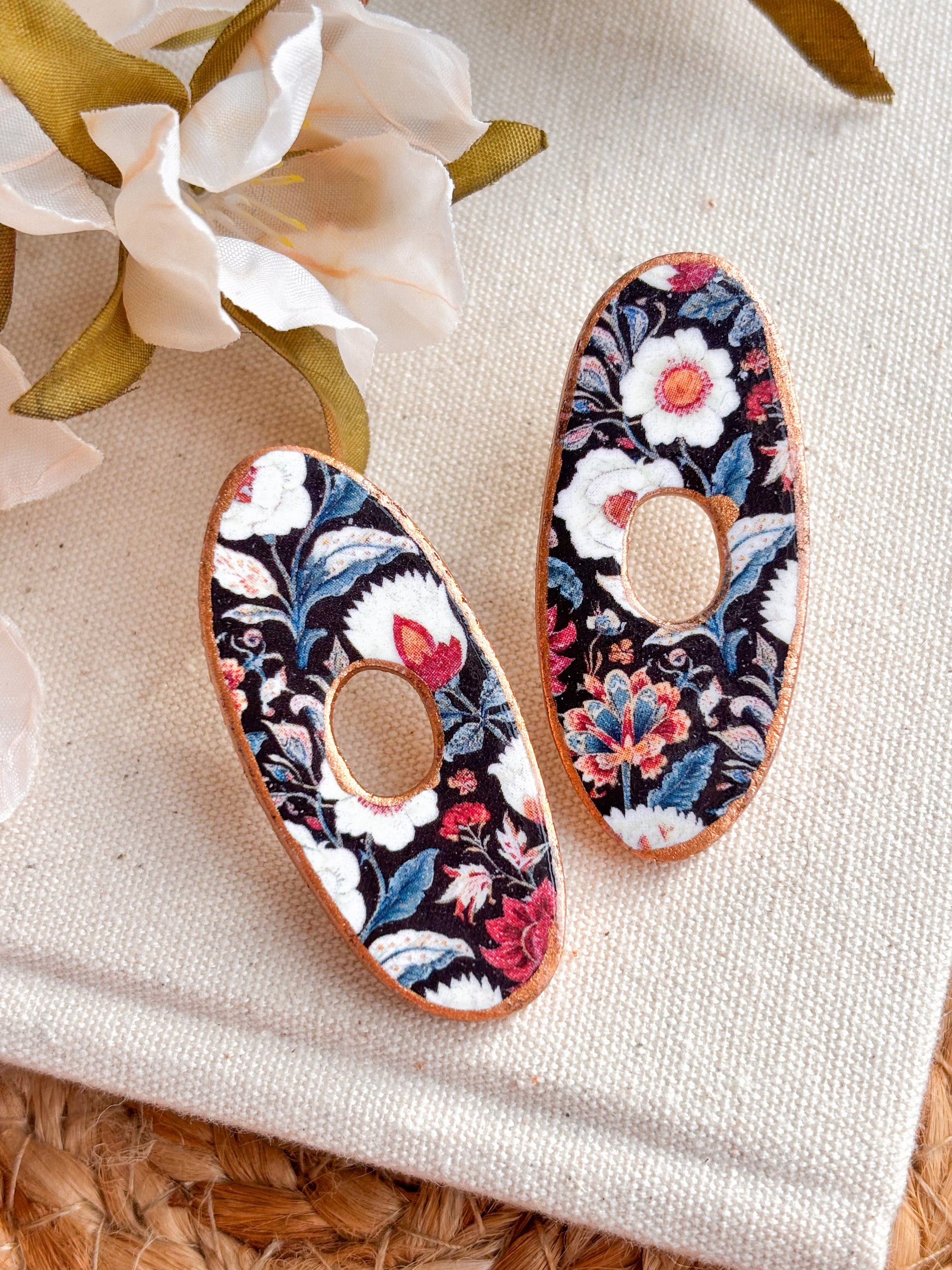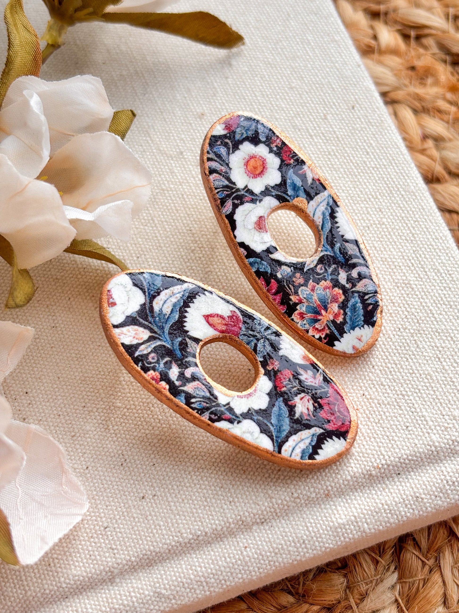 Large organic handcrafted studs in a choice of ivory or black florals. Hypoallergenic posts.