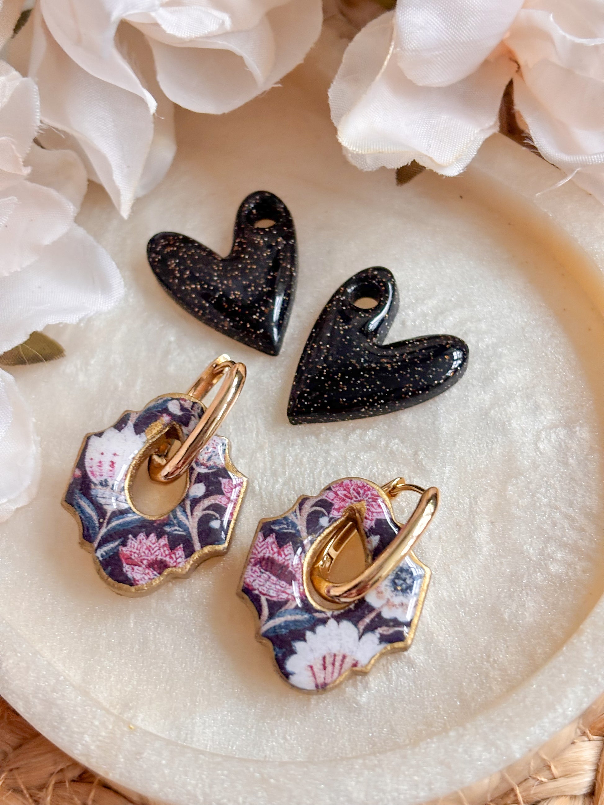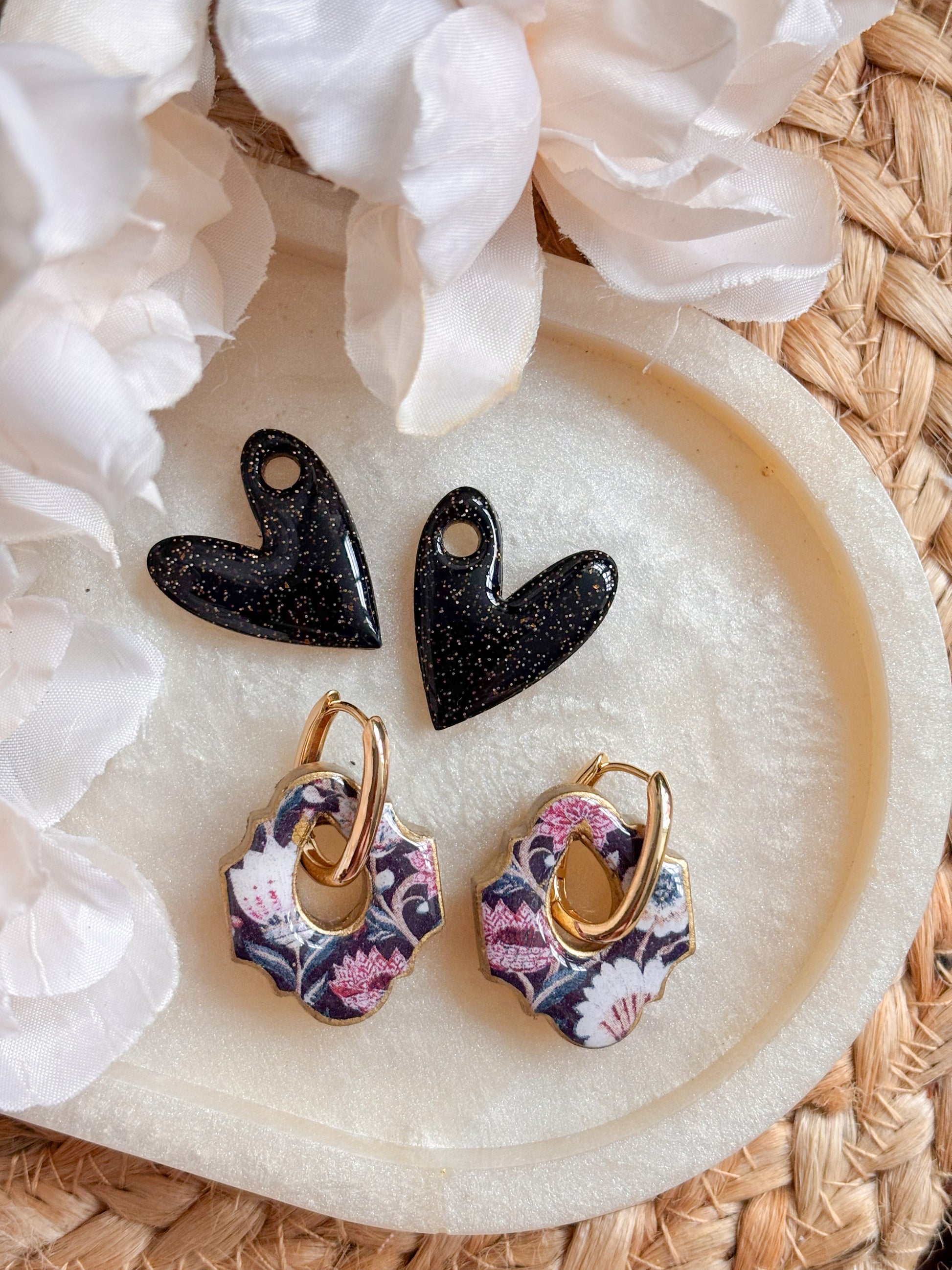 A pair each of floral design Moroccan and black sparkly heart charms and pair of gold plated huggies.