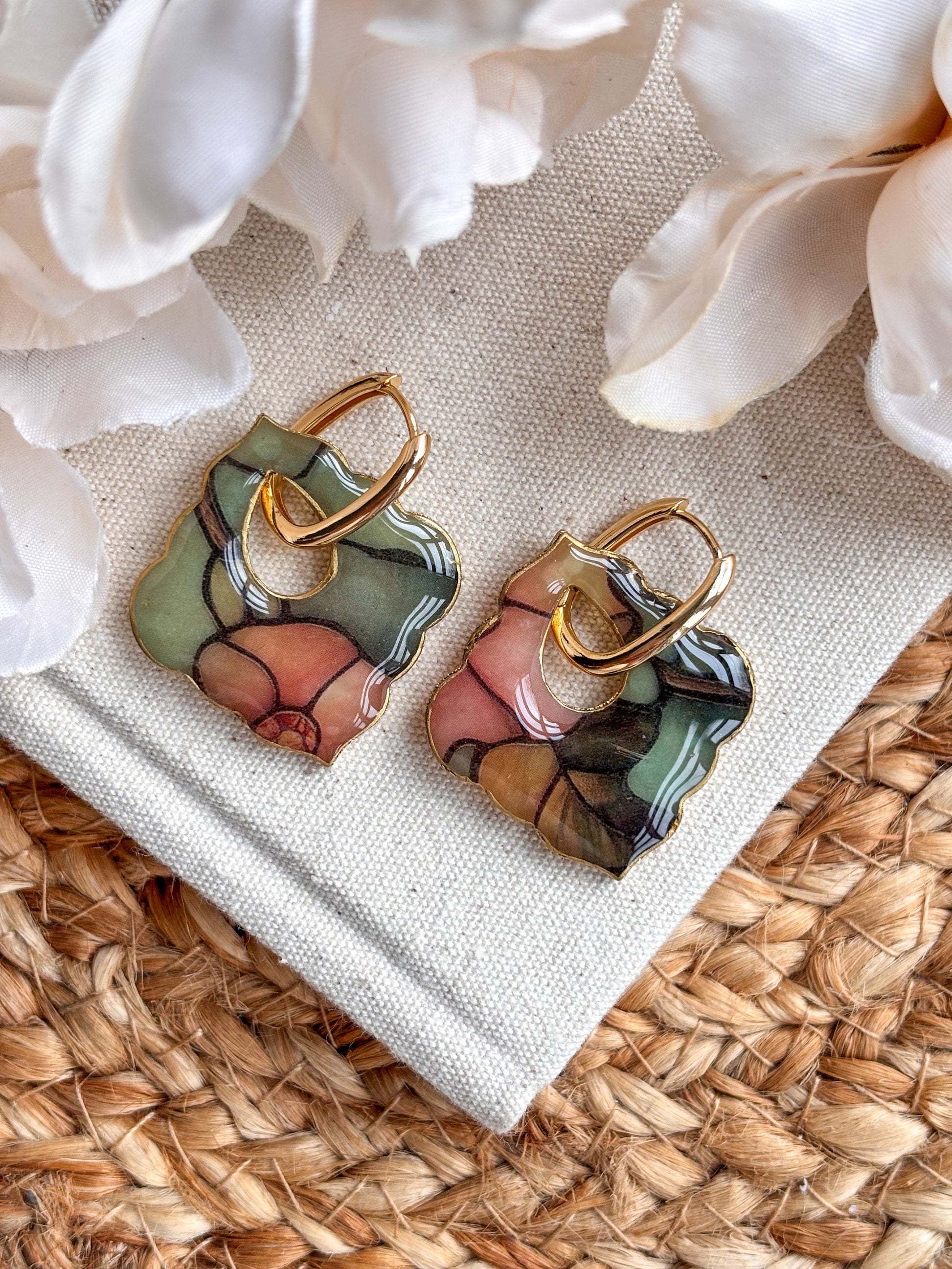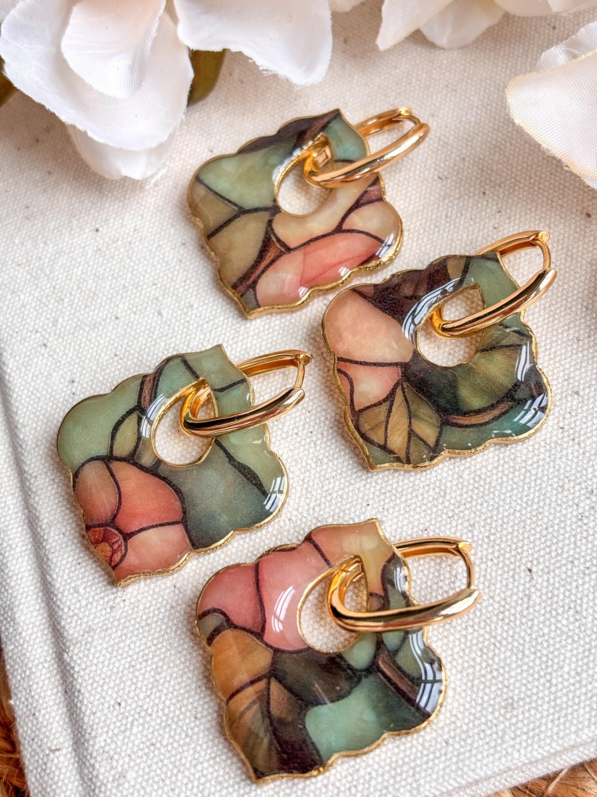 Pretty handcrafted Moroccan style, stained glass effect crescent, charms with gold plated oval huggies, (optional).