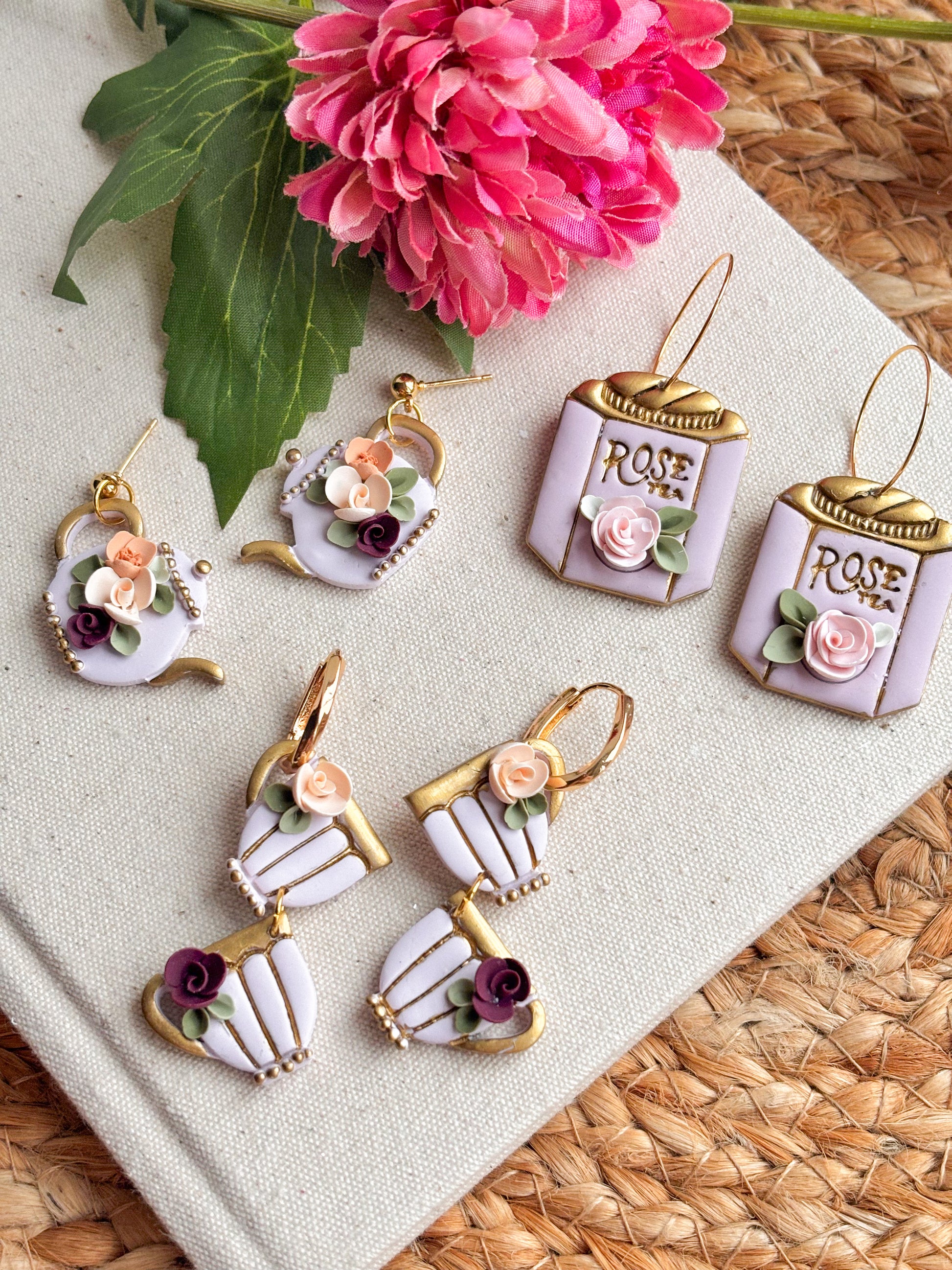 Cute lilac rose tea canisters on 20mm gold plated hoops.