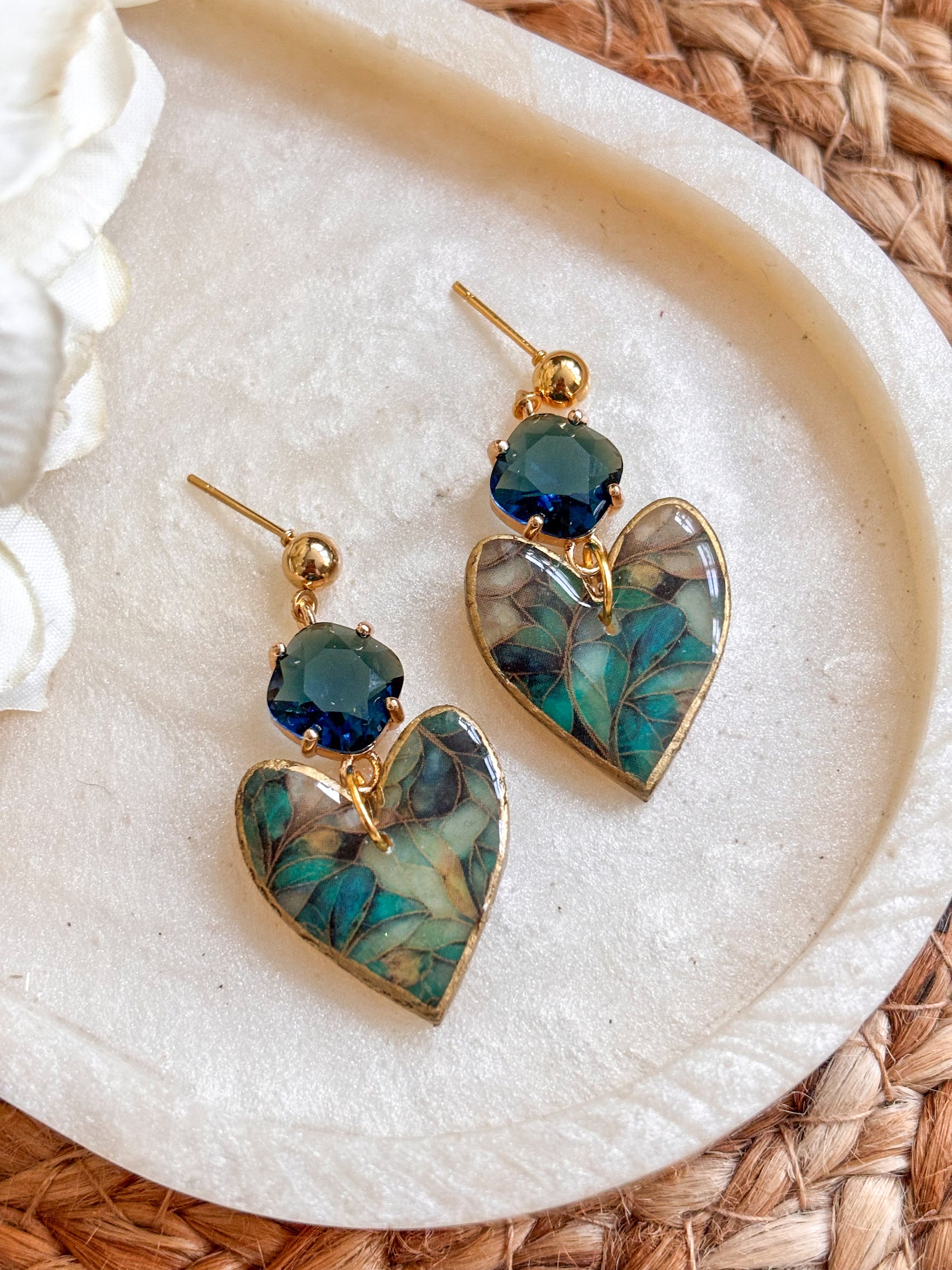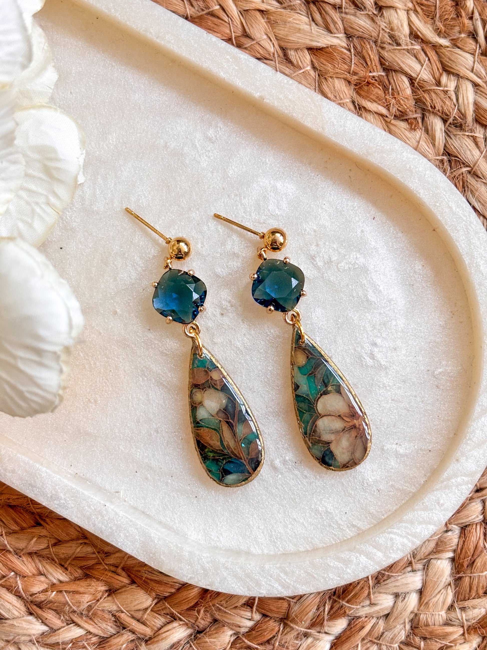 Pretty blue design stained glass effect charms on blue glass charms and gold plated ball studs.