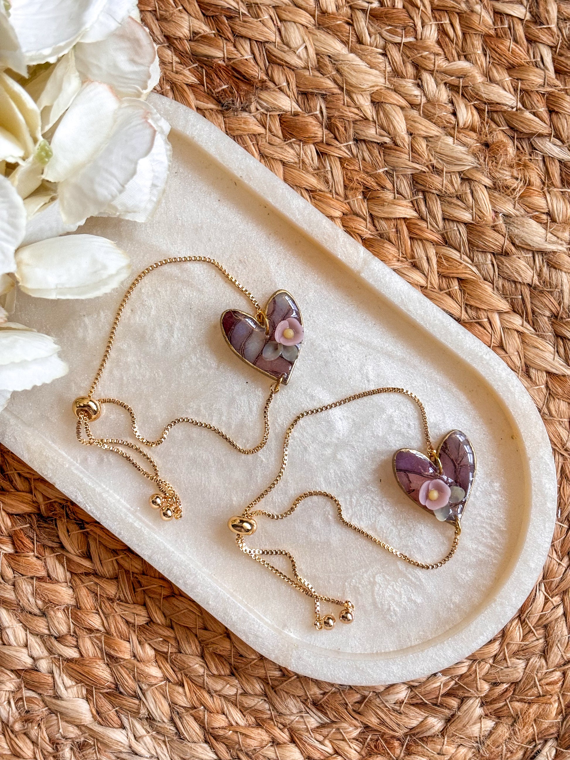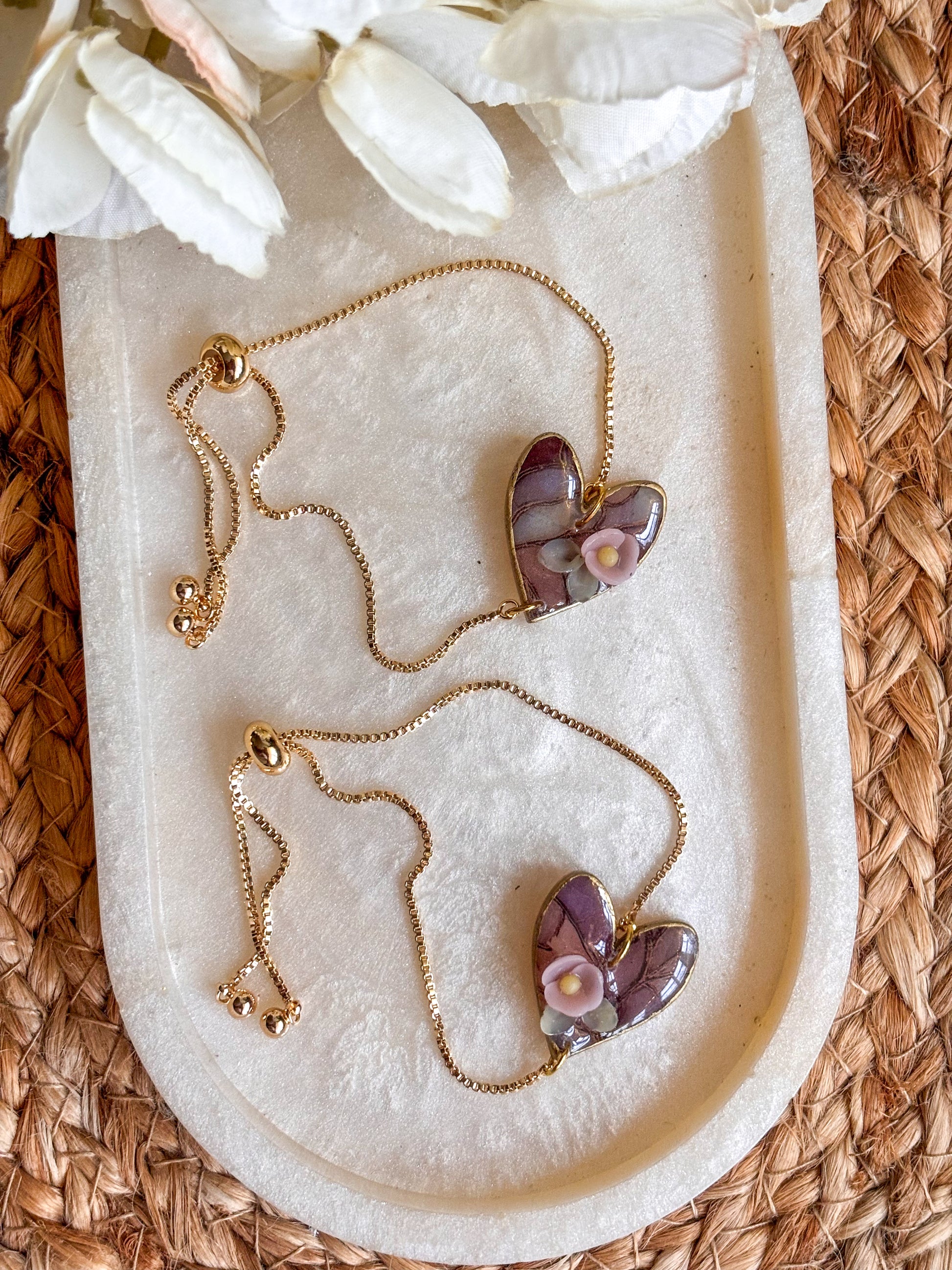 Sweet stained glass effect hearts with soft pink florals on a gold plated extendable bracelet.