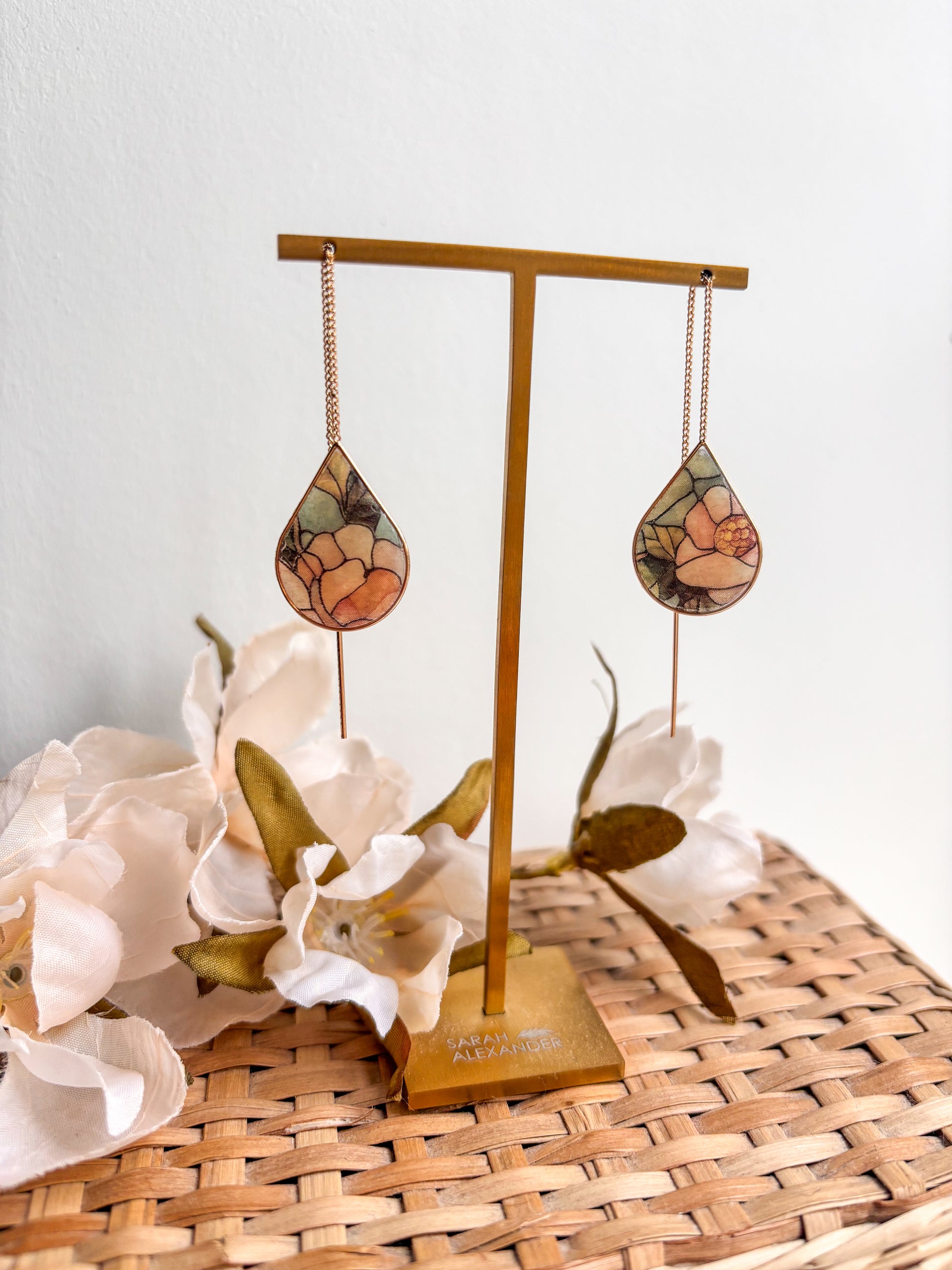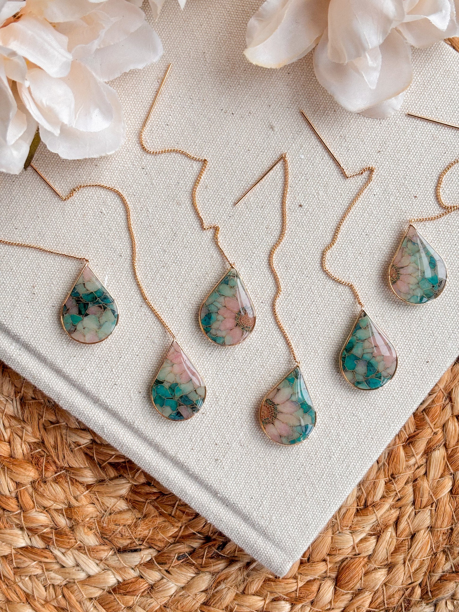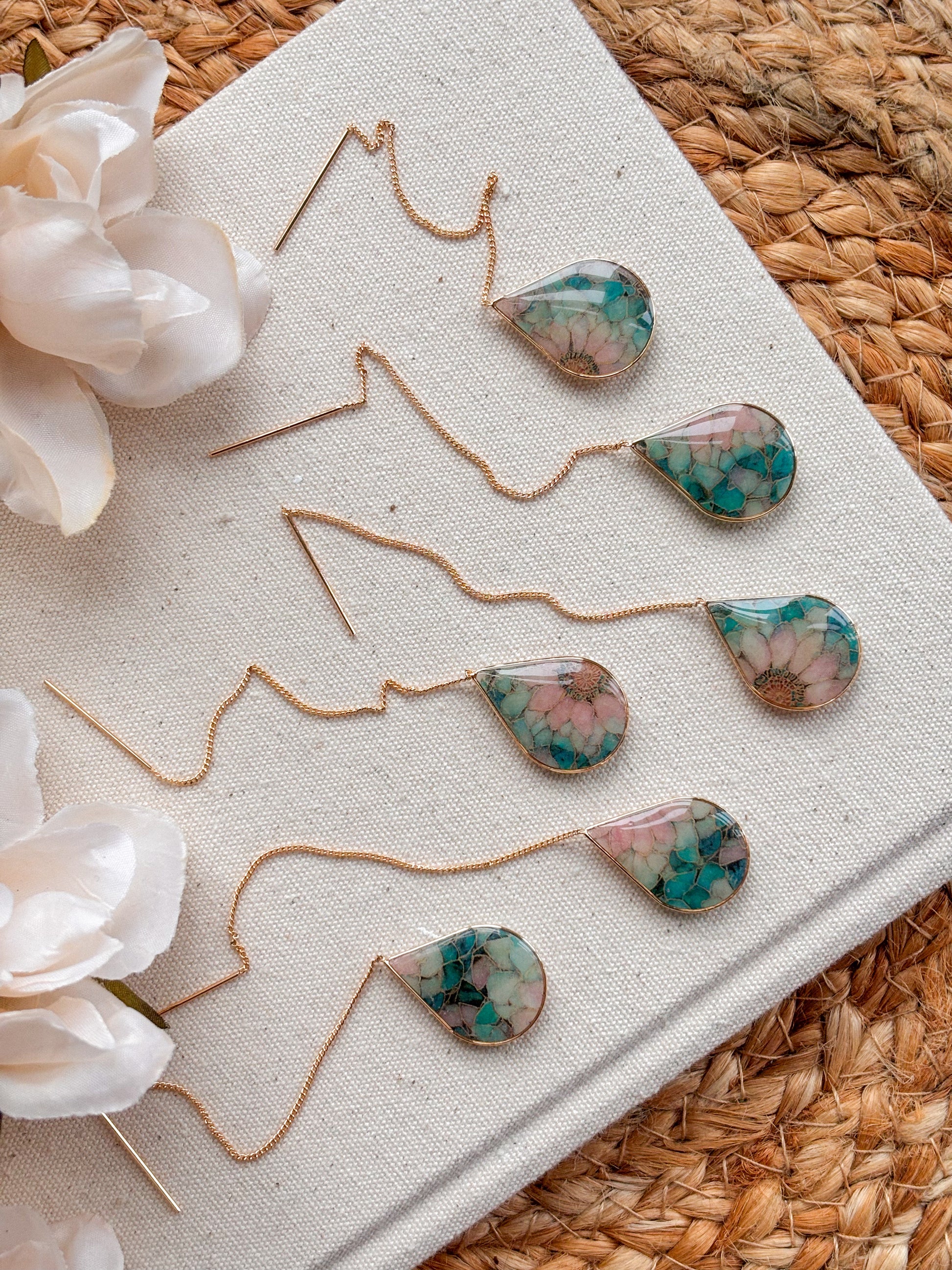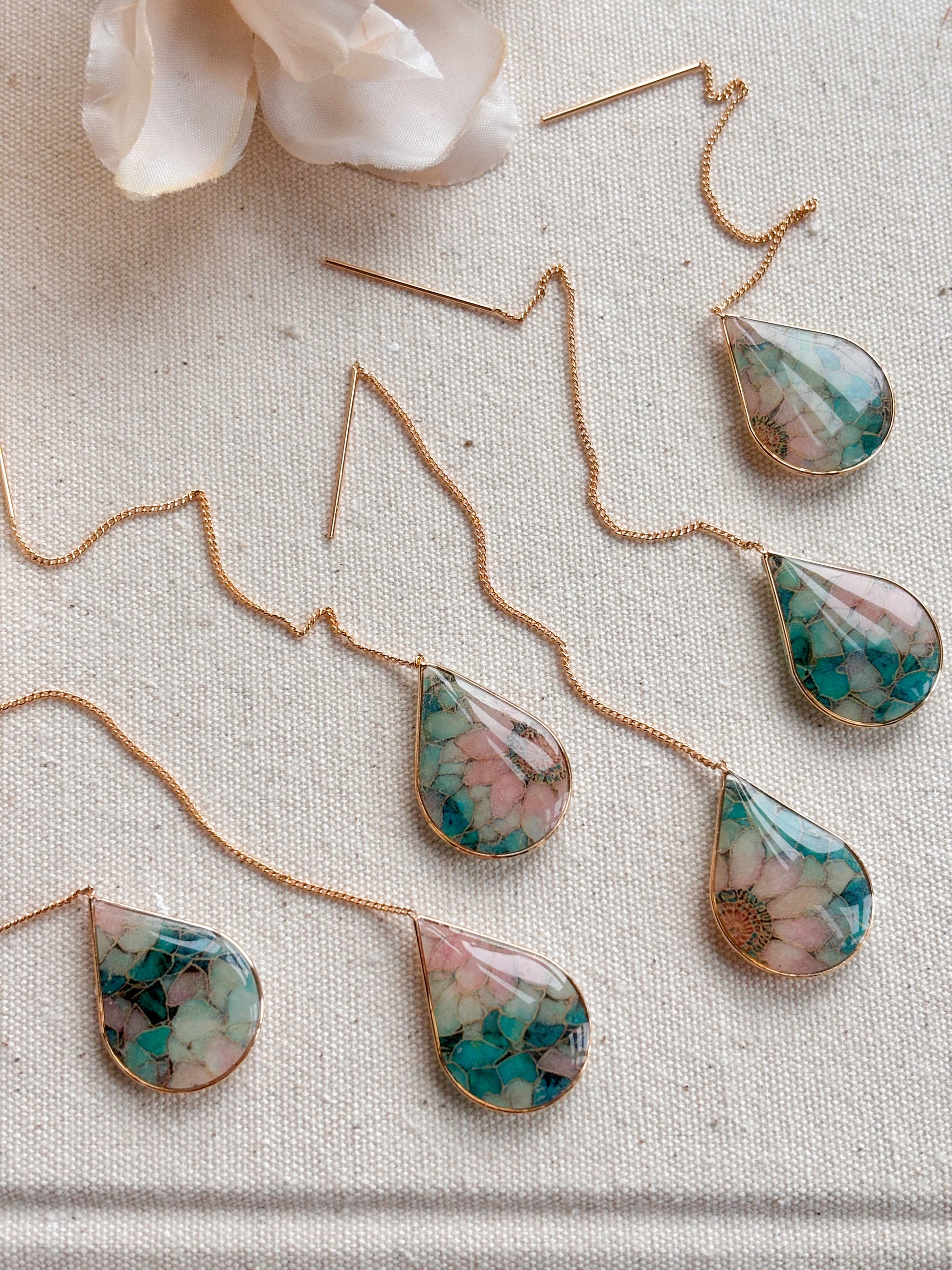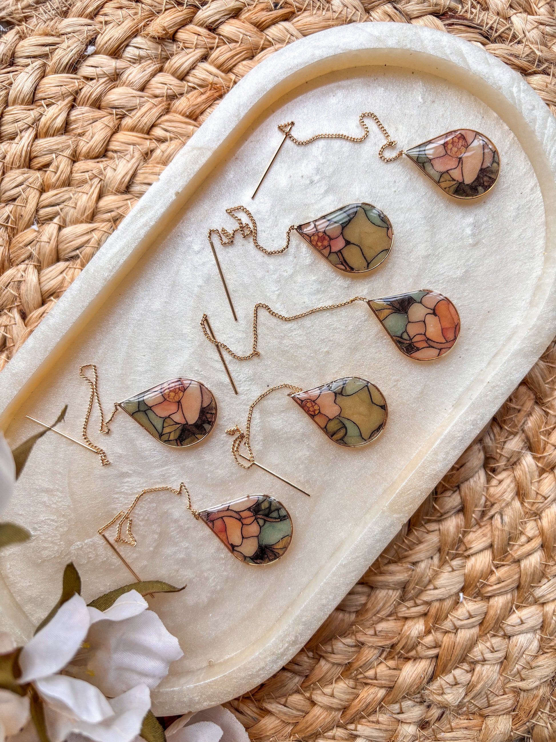Pretty stained glass effect drops on gold plated threader earrings with shiny resin sealant.